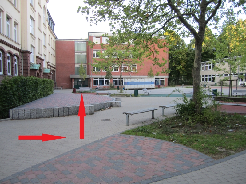 auf dem Schulhof sieht man dann zur Linken einen roten Klinkerbau,
